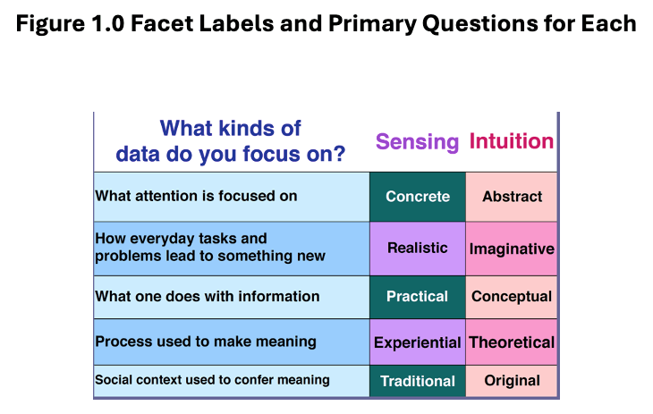 Figure 1.0 presents the set of Facets associated with Sensing and Intuiting preferences and the question the Facet is intended to answer. Think about the central question for that Facet as a point of focus about the behavior the learner has selected. If a learner votes a 5 on Concrete or Abstract, the learner is saying that regardless of my Sensing or Intuiting preference, my attention is directed to either Concrete details or Abstractions about the situation. The learner also needs to provide examples of how this may show up in everyday life, which is often very easy to do.