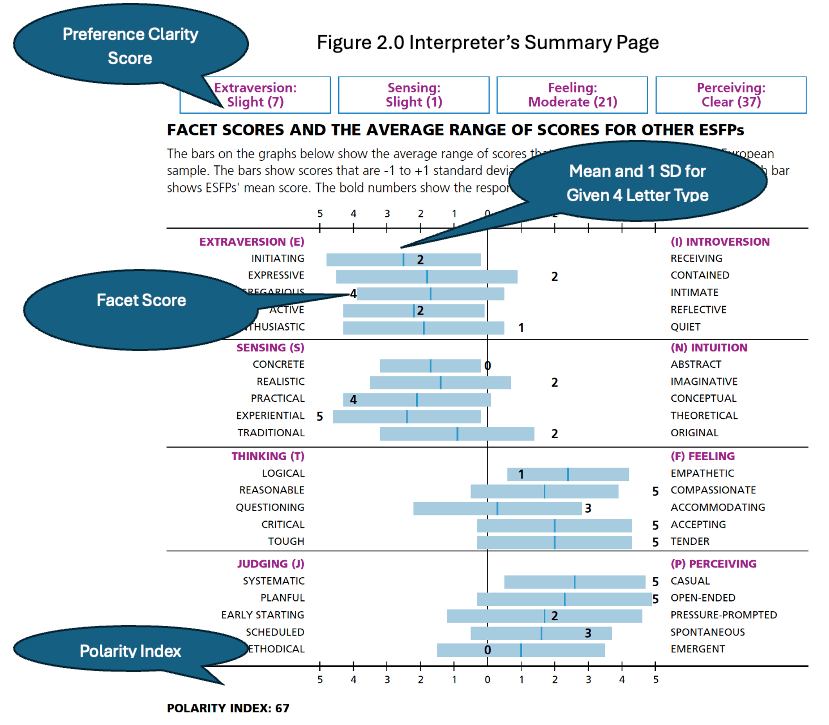 The Polarity Index suggests that this learner consistently voted toward the various ends of the 20 continuums of the Facets. For example, 20 Facets with a 5 score would have an Index of 100. Such a score is extremely rare. It is easy to see by just looking at the means for ESFPs that the typical Polarity Index will be easily in the 60s. An Interpreter would expect the individual to quickly affirm the behaviors associated with the 4s and 5s.